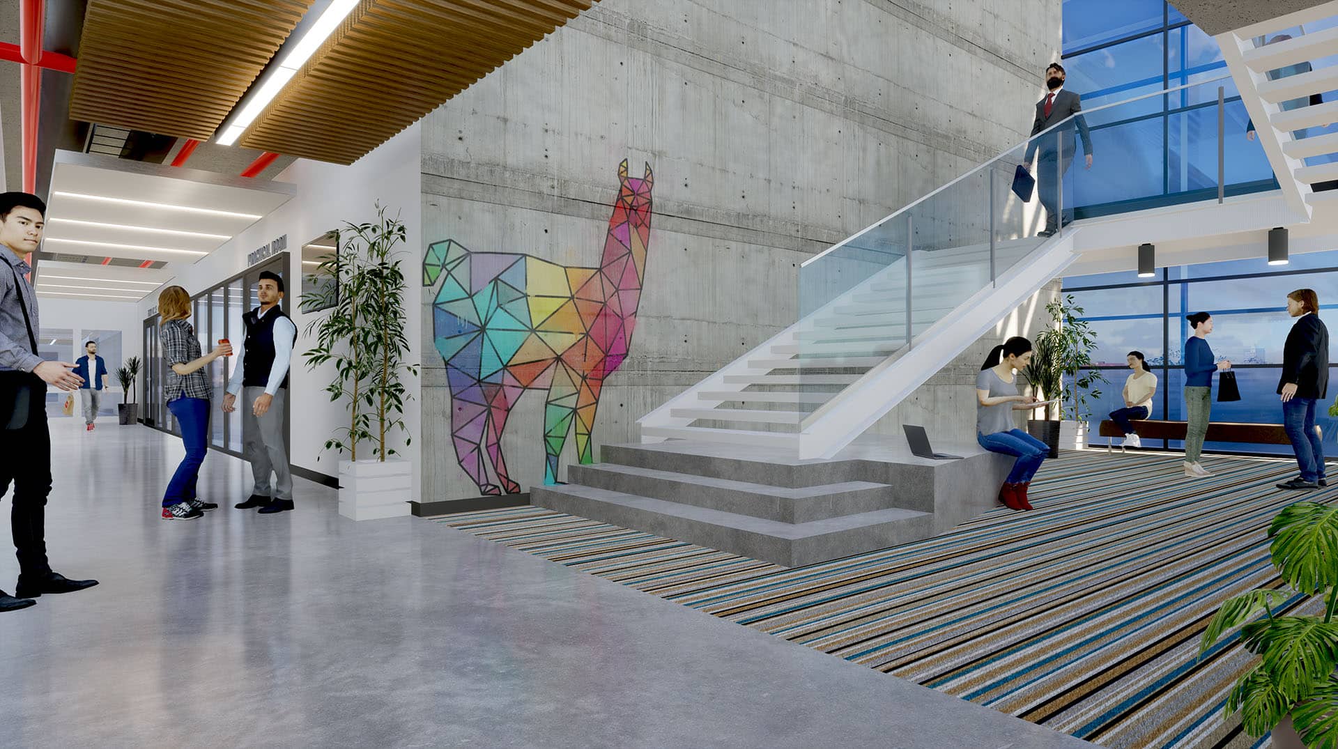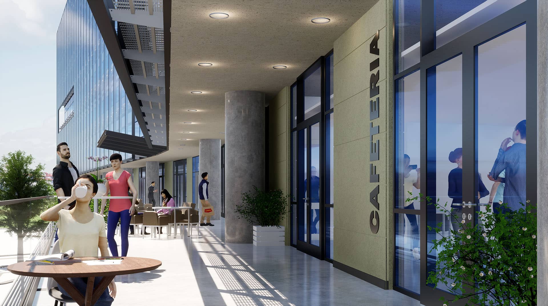 The concept of flexibility is not limited to the spatial program, but is also reflected in the fully glazed transparent front facade of the building, which extends beyond the building edges on each side, signifying the scalable and extensible nature of its design.