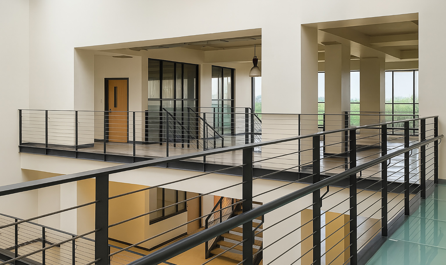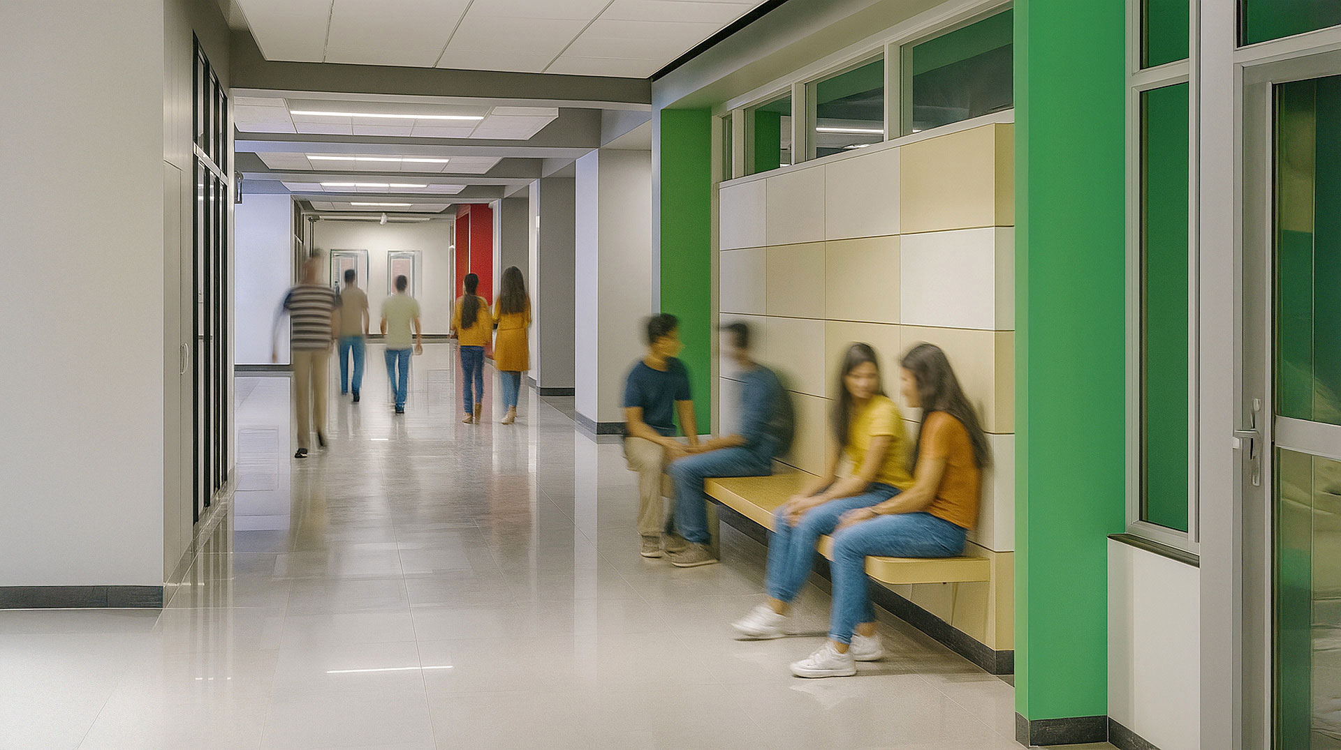 Each corridor is painted in a different colour, giving the space its unique identity. The learning environment of this campus, fully equipped with tools and resources, is enhanced by a heightened sensorial experience with light, shadows, colours and textures at play.