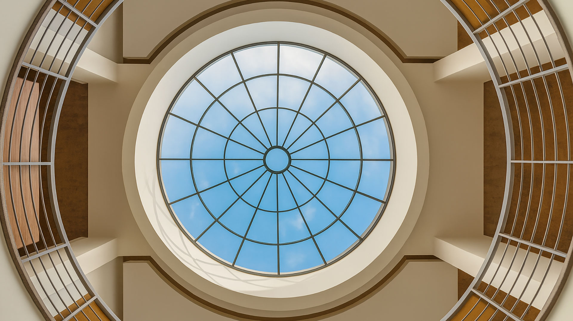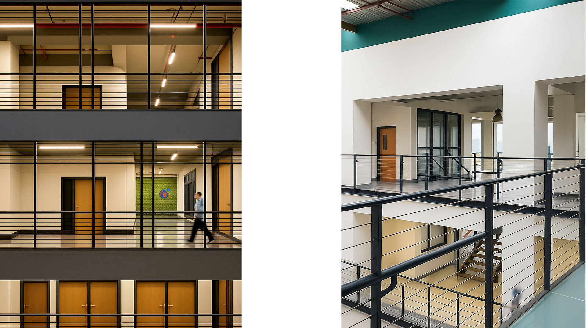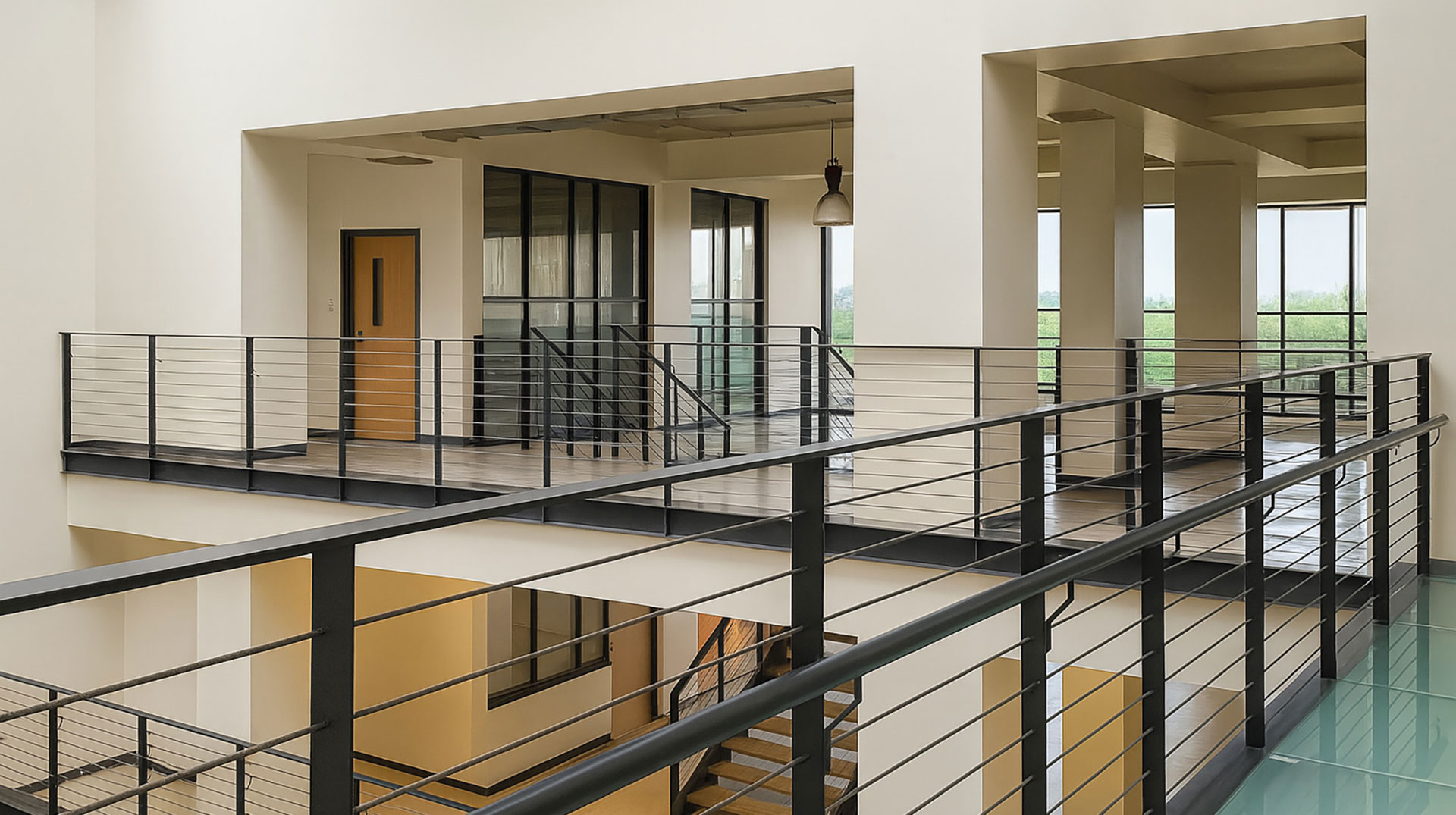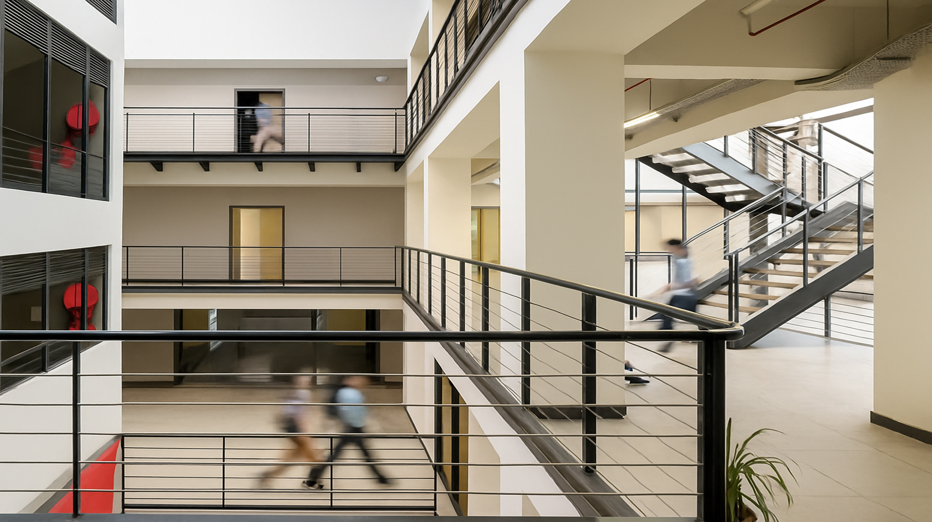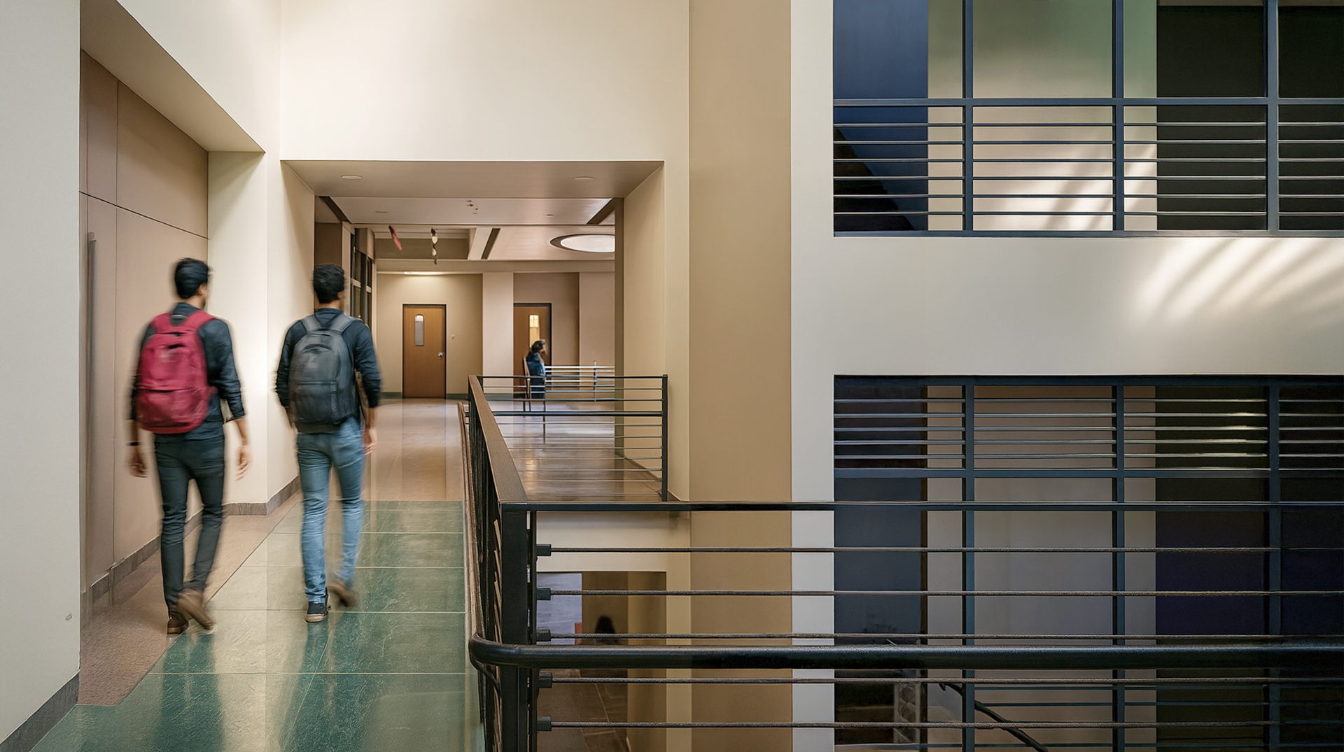 The linearity of the spaces is broken by courtyards, double height spaces, and skylights to maximize visual transparency. The steel staircase, adjacent to the central atrium is a design element that fosters connectivity, both spatial and visual.