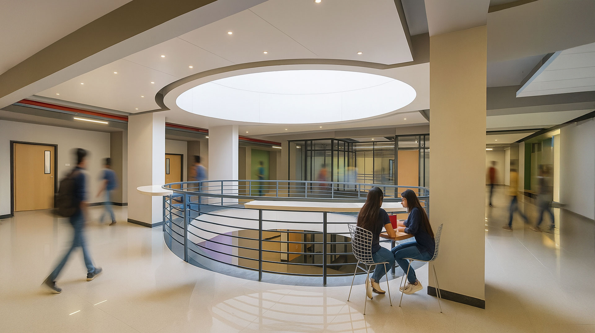 Classrooms along the corridors are furnished with portal seatings on the outside that encourages chance interaction among the learners and faculties. The 30, 60 and 120 occupancy classrooms have a different furniture layout, suiting its strength and purpose.
