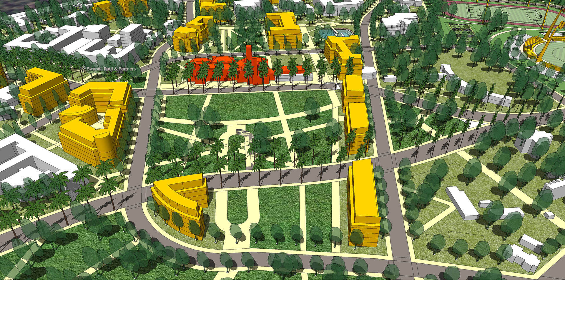 The Campus Master plan focuses on enhancing the connectivity, walkability and flexibility to accommodate the future uses of the campus. New streets and pedestrian pathways interweave through the courtyards of buildings forming a web of connections. The Master plan conceptualises distinct zoning, a network of open spaces, a sports village and a student’s village for the campus. Architecture guidelines and signage regulations will enhance the overall identity of the campus.