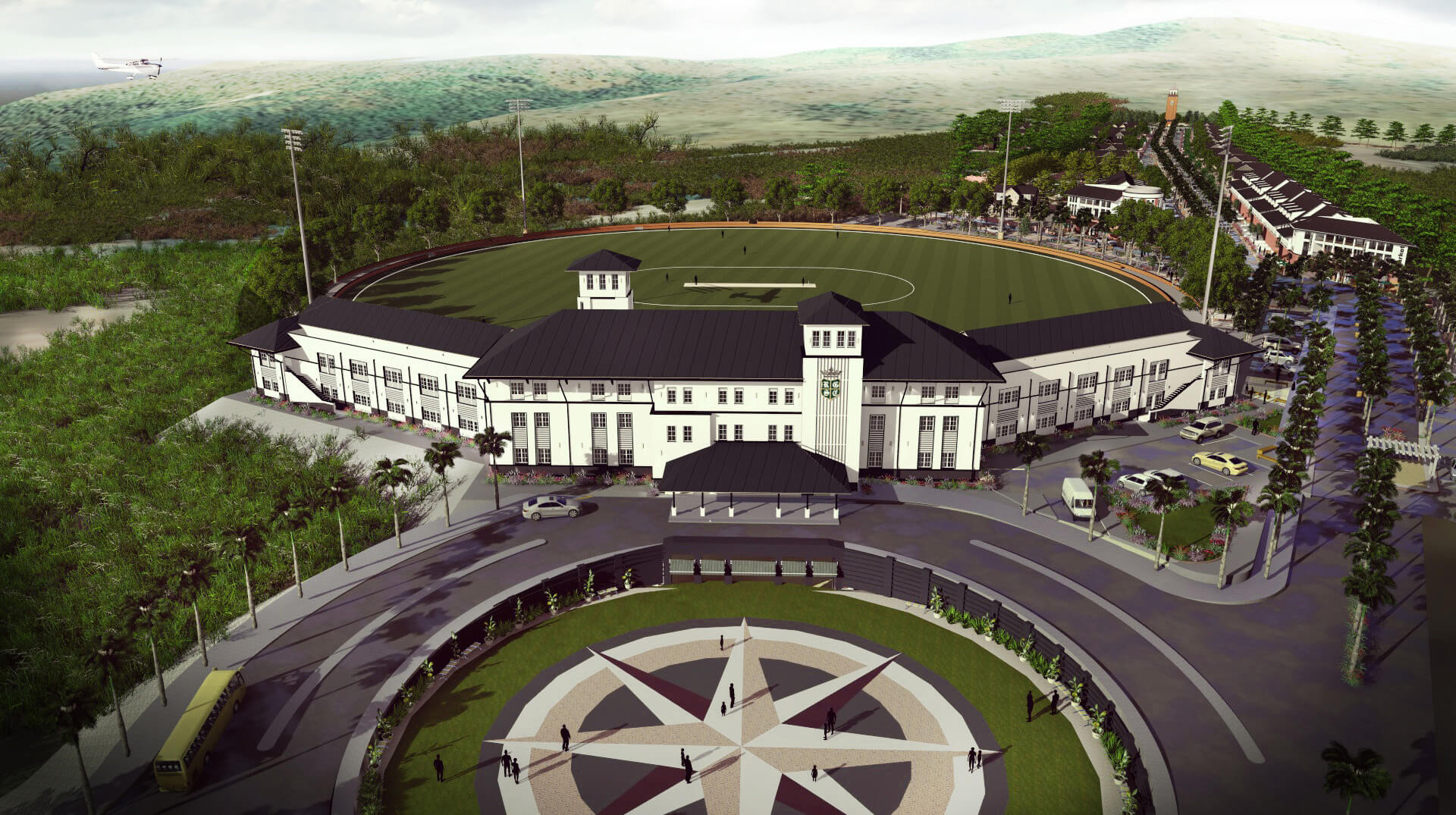 Featuring a clock tower and an observatory, between these two wings is the three three-story “Central Block”. It houses the guest lounge, exercise room, locker rooms, cafeteria, sports bar, fine dining and a conference room.