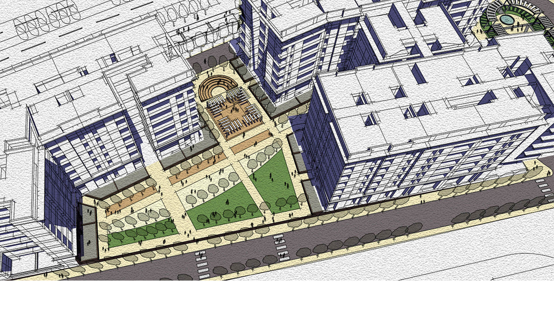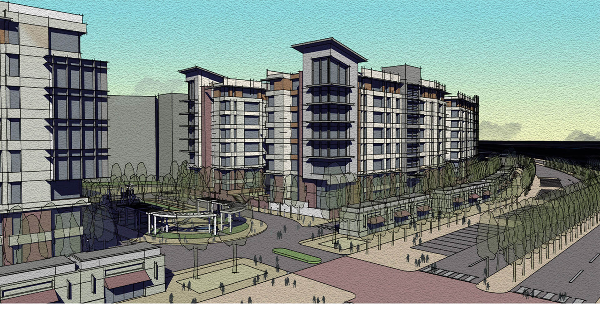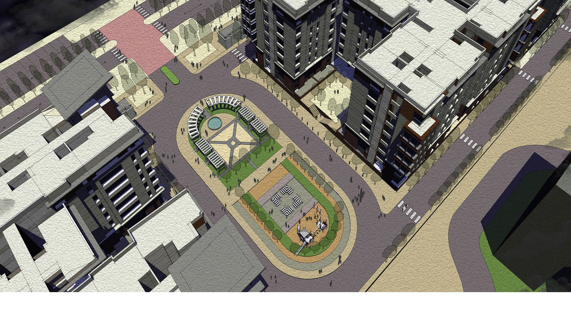 The second part of the site zoned as Commercial use will consist of a 1,20,000 sq. ft mixed-use building with 4 level multistory parking garage, food court, gaming zone, offices, 30,000 sq. ft. grocery store and a 6-screen multiplex. The Neighborhood Center will form a regional draw for Mysore and will attract people from all around. Located at an important crossroad across the railway track, the six-story building will be an iconic, identifiable landmark and serve the needs of residents in the area.