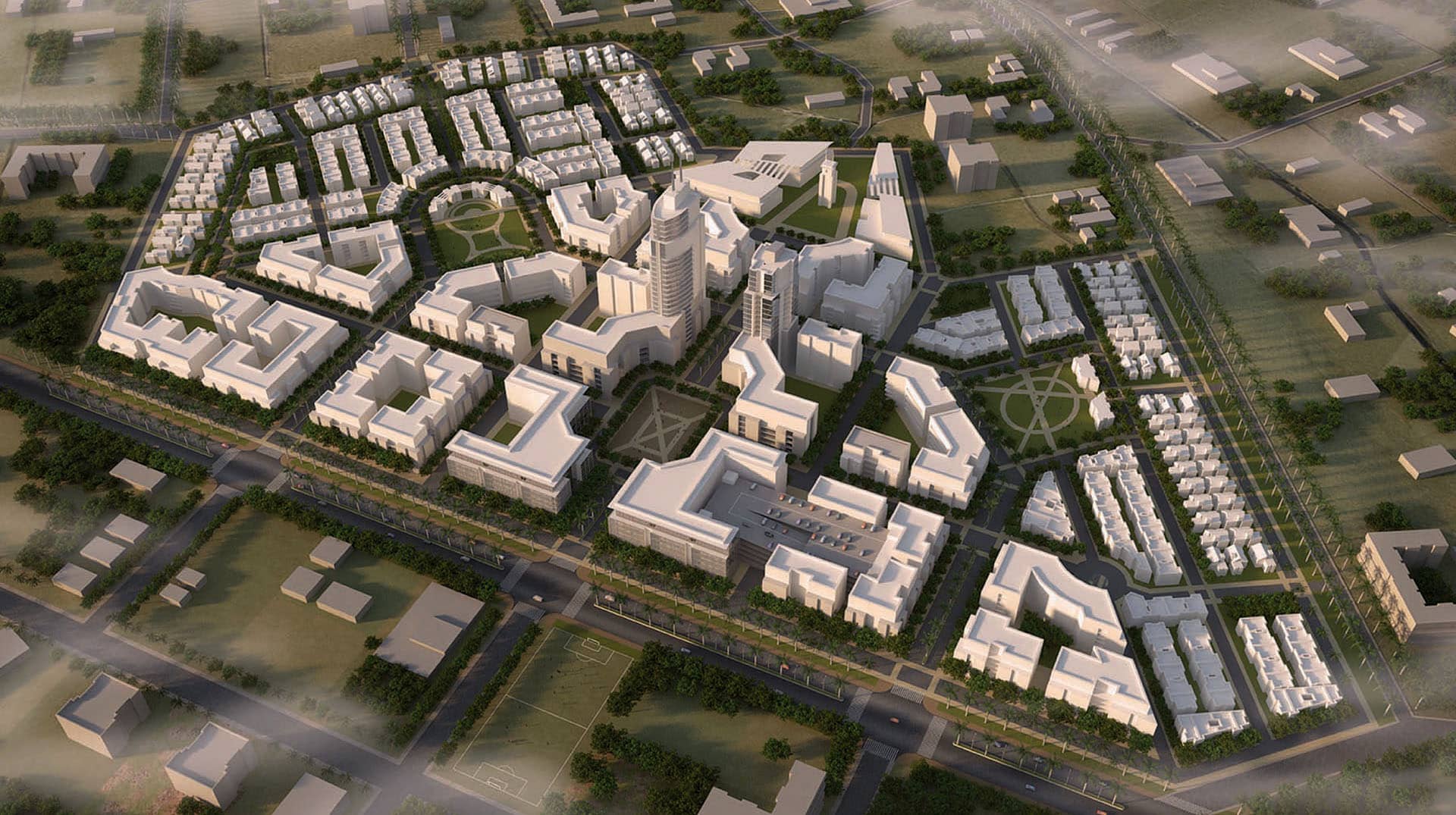 The overall Masterplan builds a compact and vibrant community, with parks and open spaces. The residential blocks are designed in clusters around private courtyards featuring a variety of building types such as apartments, affordable housing, rowhouses, and villas, to meet the requirements of a diverse demographic profile.